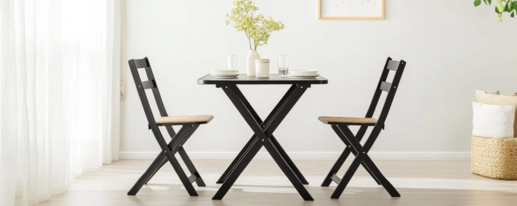 Existem diversos estilos e funções de mesas que podem ser facilmente dobradas e guardadas quando não estão em uso. Essas peças são perfeitas para otimizar espaço em ambientes pequenos, podendo ser usadas para refeições, trabalho ou estudo. Cadeiras empilháveis ou dobráveis, podem complementar o conjunto, sendo também uma boa opção para quem quer receber visitas, economizando espaço em casa.