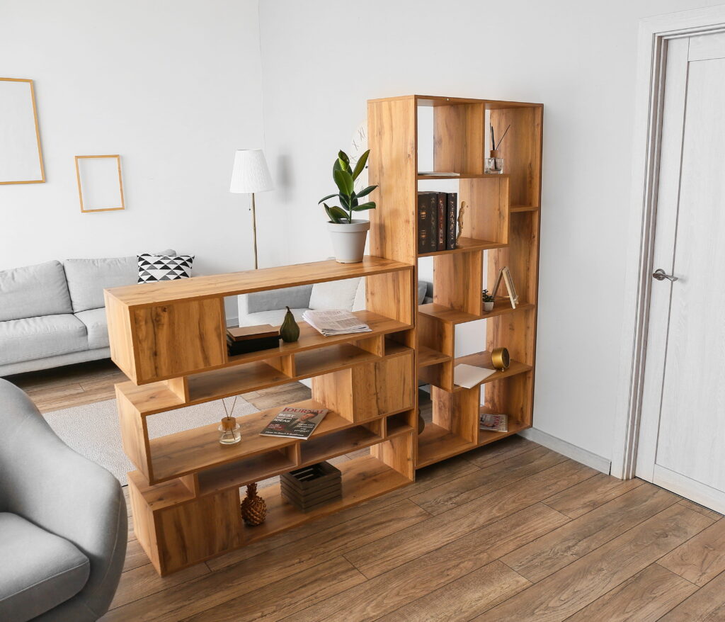 Estantes que armazenam livros e objetos decorativos, podem servir também como divisórias de ambientes. Elas ajudam a organizar o espaço e definem áreas, como sala de estar, espaço de trabalho ou quarto de dormir, sem a necessidade de paredes. Com caixas ou cestos, você pode esconder itens indesejados, sem interferir na decoração.